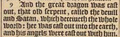 9 And the great dragon was cast out, that old serpent, called the deuill and Satan, which deceiueth the whole world: hee was cast out into the earth, and his angels were cast out with him.