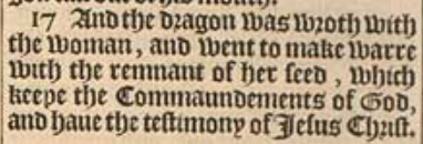 17 And the dragon was wroth with the woman, and went to make warre with the remnant of her seed, which keepe the Commaundements of God, and haue the testimony of Iesus Christ.