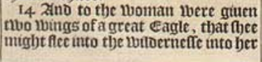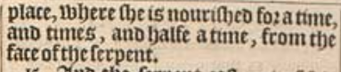 14 And to the woman were giuen two wings of a great Eagle, that shee might flee into the wildernesse into her place, where she is nourished for a time, and times, and halfe a time, from the face of the serpent.