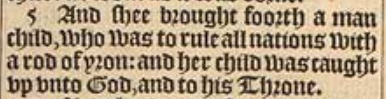 5 And shee brought foorth a man child, who was to rule all nations with a rod of yron: and her child was caught vp vnto God, and to his Throne.