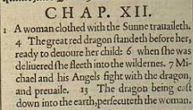 1 A woman clothed with the Sunne trauaileth. 4 The great red dragon standeth before her, ready to deuoure her child: 6 when she was deliuered she fleeth into the wildernes. 7 Michael and his Angels fight with the dragon, and preuaile. 13 The dragon being cast down into the earth, persecuteth the woman.