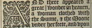 1 And there appeared a great || wonder in heauen, a woman clothed with the Sunne, & the Moone vnder her feete, and vpon her head a Crowne of twelue starres:[||Or, signe.]