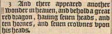 3 And there appeared another || wonder in heauen, and behold a great red dragon, hauing seuen heads, and ten hornes, and seuen crownes vpon his heads.[||Or, signe.]