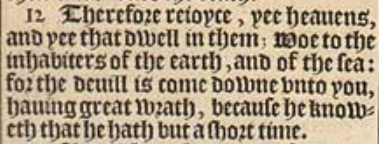 12 Therefore reioyce, yee heauens, and yee that dwell in them; Woe to the inhabiters of the earth, and of the sea: for the deuill is come downe vnto you, hauing great wrath, because he knoweth that he hath but a short time.