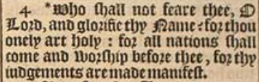 4 *Who shall not feare thee, O Lord, and glorifie thy Name? for thou onely art holy: for all nations shall come and worship before thee, for thy iudgements are made manifest.[*Iere.10.7.]