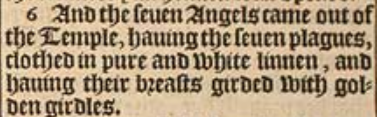 6 And the seuen Angels came out of the Temple, hauing the seuen plagues, clothed in pure and white linnen, and hauing their breasts girded with golden girdles.