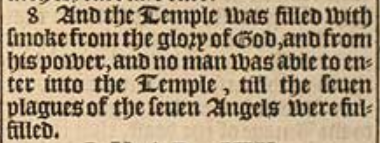 8 And the Temple was filled with smoke from the glory of God, and from his power, and no man was able to enter into the Temple, till the seuen plagues of the seuen Angels were fulfilled.