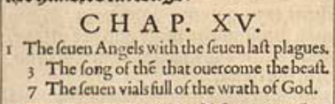 1 And I saw another signe in heauen great and marueilous, seuen Angels hauing the seuen last plagues, for in them is filled vp the wrath of God.