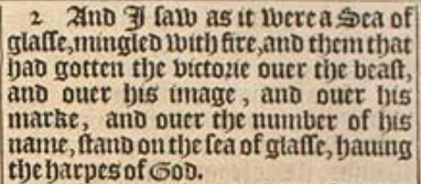 2 And I saw as it were a Sea of glasse, mingled with fire, and them that had gotten the victorie ouer the beast, and ouer his image, and ouer his marke, and ouer the number of his name, stand on the sea of glasse, hauing the harpes of God.