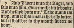 9 And I went vnto the Angel, and said vnto him, Giue me the little booke. And he sayd vnto me, *Take it, and eat it vp, and it shall make thy belly bitter, but it shall bee in thy mouth sweete as hony.[*Ezek.2.8. and 3.3.]