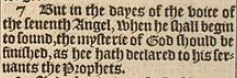 7 But in the dayes of the voice of the seuenth Angel, when he shall begin to sound, the mysterie of God should be finished, as hee hath declared to his seruants the Prophets.