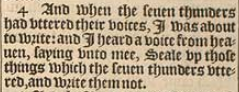 4 And when the seuen thunders had vttered their voices, I was about to write: and I heard a voice from heauen, saying vnto mee, Seale vp those things which the seuen thunders vttered, and write them not.