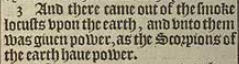3 And there came out of the smoke locusts vpon the earth, and vnto them was giuen power, as the Scorpions of the earth haue power.