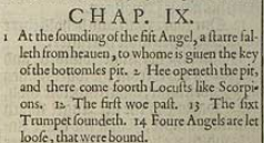 1 And the fift Angel sounded, and I saw a starre fall from heauen vnto the earth: and to him was giuen the key of the bottomlesse pitte.