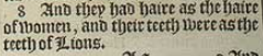 8 And they had haire as the haire of women, and their teeth were as the teeth of Lions.