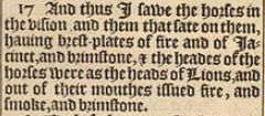 17 And thus I sawe the horses in the vision, and them that sate on them, hauing brest-plates of fire and of Iacinct, and brimstone, & the heades of the horses were as the heads of Lions, and out of their mouthes issued fire, and smoke, and brimstone.