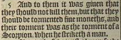5 And to them it was giuen that they should not kill them, but that they should be tormented fiue moneths, and their torment was as the torment of a Scorpion, when he striketh a man.