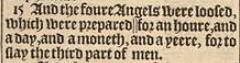 15 And the foure Angels were loosed, which were prepared ||for an houre, and a day, and a moneth, and a yeere, for to slay the third part of men.[||Or, at.]