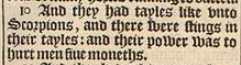 10 And they had tayles like vnto Scorpions, and there were stings in their tayles: and their power was to hurt men fiue moneths.