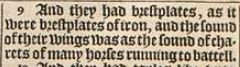 9 And they had brestplates, as it were brestplates of iron, and the sound of their wings was as the sound of charets of many horses running to battell.