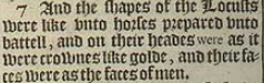 7 And the shapes of the Locusts were like vnto horses prepared vnto battell, and on their heades were as it were crownes like golde, and their faces were as the faces of men.