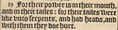 19 For their power is in their mouth, and in their tailes: for their tailes were like vnto serpents, and had heads, and with them they doe hurt.