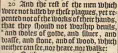 20 And the rest of the men which were not killed by these plagues, yet repented not of the works of their hands, that they should not worship deuils, *and idoles of golde, and siluer, and brasse, and stone, and of wood, which neither can see, nor heare, nor walke:[*Psal. 115. 4. & 135. 15.]