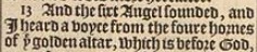 13 And the sixt Angel sounded, and I heard a voyce from the foure hornes of þe golden altar, which is before God,