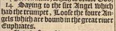 14 Saying to the sixt Angel which had the trumpet, Loose the foure Angels which are bound in the great riuer Euphrates.