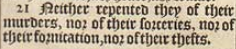 21 Neither repented they of their murders, nor of their sorceries, nor of their fornication, nor of their thefts.
