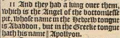 11 And they had a king ouer them, which is the Angel of the bottomlesse pit, whose name in the Hebrew tongue is Abaddon, but in the Greeke tongue hath his name ||Apollyon.[||That is to say, A destroyer.]