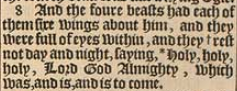8 And the foure beasts had each of them sixe wings about him, and they were full of eyes within, and they rest not day and night, saying, *holy, holy, Lord God Almighty, which was, and is, and is to come.[*Gr. they haue no rest. , Esai.6.3.]