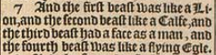7 And the first beast was like a Lion, and the second beast like a Calfe, and the third beast had a face as a man, and the fourth beast was like a flying Egle.