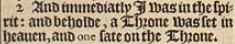 2 And immediatly I was in the spirit: and beholde, a Throne was set in heauen, and one sate on the Throne.
