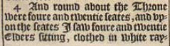 4 And round about the Throne were foure and twentie seates, and vpon the seates I saw foure and twentie Elders sitting, clothed in white rayment, and they had on their heades crownes of golde.
