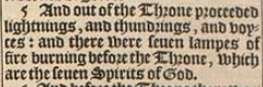 5 And out of the Throne proceeded lightnings, and thundrings, and voyces: and there were seuen lampes of fire burning before the Throne, which are the seuen Spirits of God.