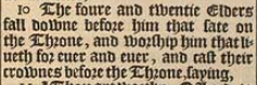 10 The foure and twentie Elders fall downe before him that sate on the Throne, and worship him that liueth for euer and euer, and cast their crownes before the Throne, saying,