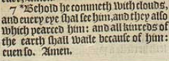 7 *Behold he commeth with clouds, and euery eye shal see him, and they also which pearced him: and all kinreds of the earth shall waile because of him: euen so. Amen.[*Matt. 24. 30.]