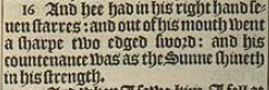 16 And hee had in his right hand seuen starres: and out of his mouth went a sharpe two edged sword: and his countenance was as the Sunne shineth in his strength.