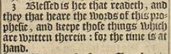 3 Blessed is hee that readeth, and they that heare the words of this prophesie, and keepe those things which are written therein: for the time is at hand.