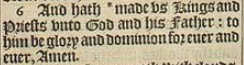 6 And hath *made vs Kings and Priests vnto God and his Father: to him be glory and dominion for euer and euer, Amen.[*1.Pet.2.5]