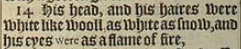 14 His head, and his haires were white like wooll as white as snow, and his eyes were as a flame of fire,