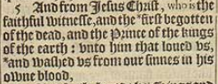 5 And from Iesus Christ, who is the faithful witnesse, and the *first begotten of the dead, and the Prince of the kings of the earth: vnto him that loued vs, and washed vs from our sinnes in his owne blood,[*1.Cor. 15. 21. coloss. 1.18. , Heb.9.14]