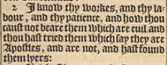 2 I know thy workes, and thy labour, and thy patience, and how thou canst not beare them which are euil, and thou hast tried them which say they are Apostles, and are not, and hast found them lyers: