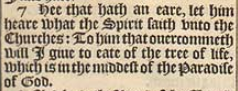 7 Hee that hath an eare, let him heare what the Spirit saith vnto the Churches: To him that ouercommeth will I giue to eate of the tree of life, which is in the middest of the Paradise of God.