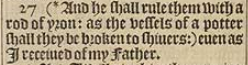 27 (*And he shall rule them with a rod of yron: as the vessels of a potter shall they be broken to shiuers:) euen as I receiued of my Father.[*Psal.2.9.]