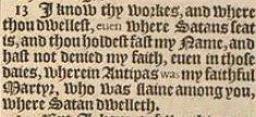 13 I know thy workes, and where thou dwellest, euen where Satans seat is, and thou holdest fast my Name, and hast not denied my faith, euen in those daies, wherein Antipas was my faithful Martyr, who was slaine among you, where Satan dwelleth.