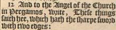 12 And to the Angel of the Church in Pergamos, write, These things saith hee, which hath the sharpe sword with two edges: