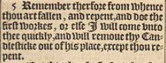 5 Remember therfore from whence thou art fallen, and repent, and doe the first workes, or else I will come vnto thee quickly, and will remoue thy Candlesticke out of his place, except thou repent.