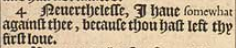 4 Neuerthelesse, I haue somewhat against thee, because thou hast left thy first loue.